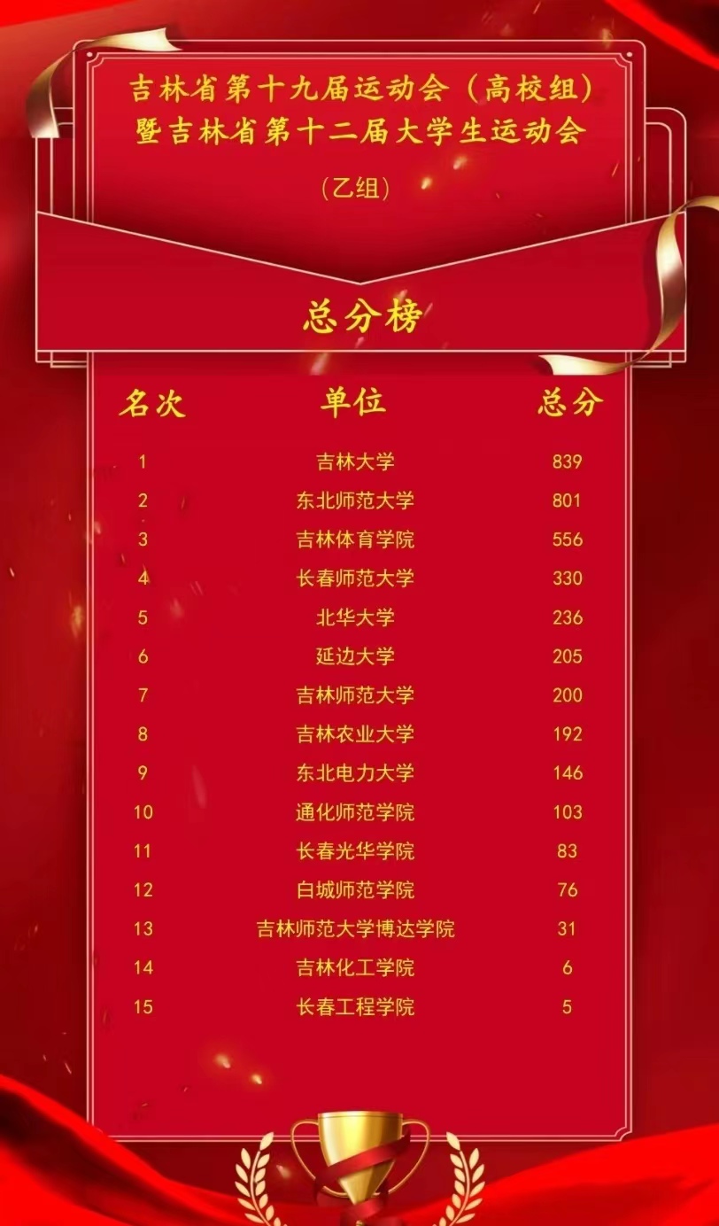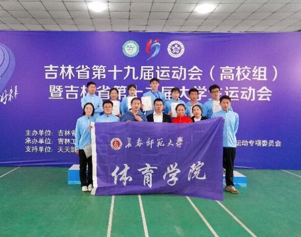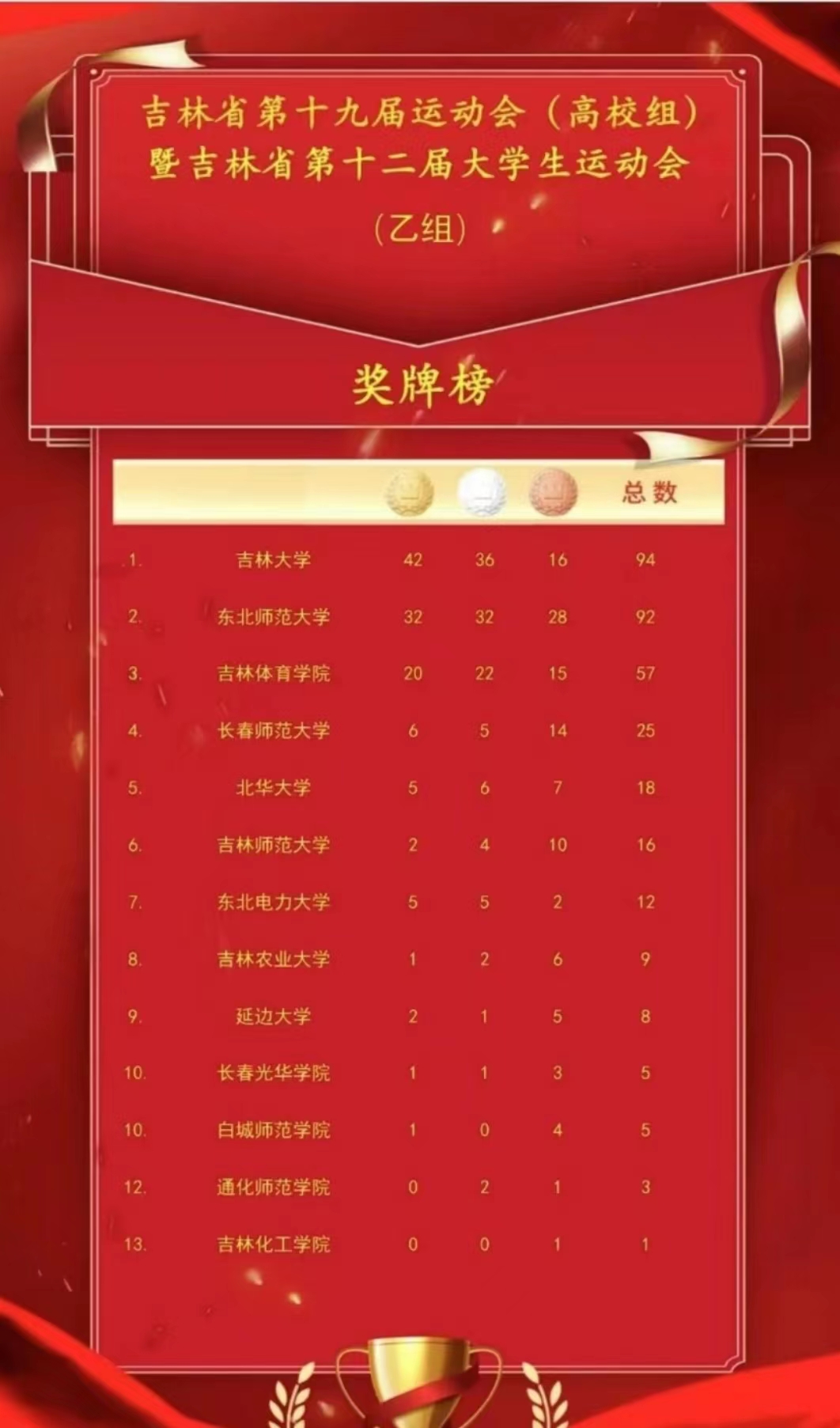 近日,在吉林省第十九届运动会(高校组)暨吉林省第十二届大学生运动会比赛中,我校运动员充分发扬奋勇争先,不怕吃苦的精神,斩获田径女子1500米、男子铁饼、女子铁饼、男子排球、男子跳绳、健美操自选动作等6个项目金牌,男子足球、武术长拳、男子单打羽毛球等5个项目银牌和男子篮球、女子排球、女子团体网球、男子乒乓球团体等14项目铜牌,最终获奖牌榜及总分榜菁英组第四名。