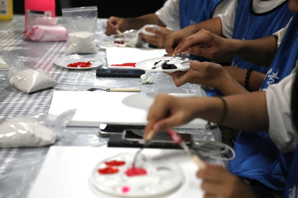 传承国韵经典,学习非遗技艺。在肌理画非遗体验课堂上,非遗传承人张赯为大家讲解了肌理画发展与绘画技巧,实践团的同学们纷纷手执画笔刮刀,发挥各自的奇思妙想,不一会,张张画布便在灵感与颜料的碰撞下呈现出变幻无穷的层次之美。
