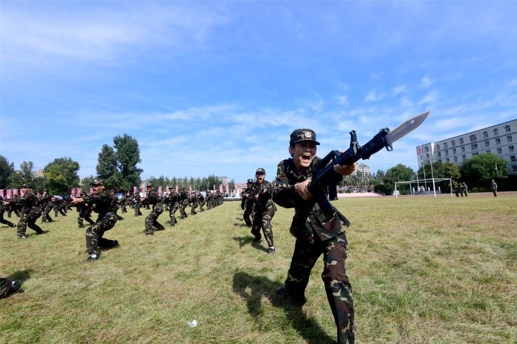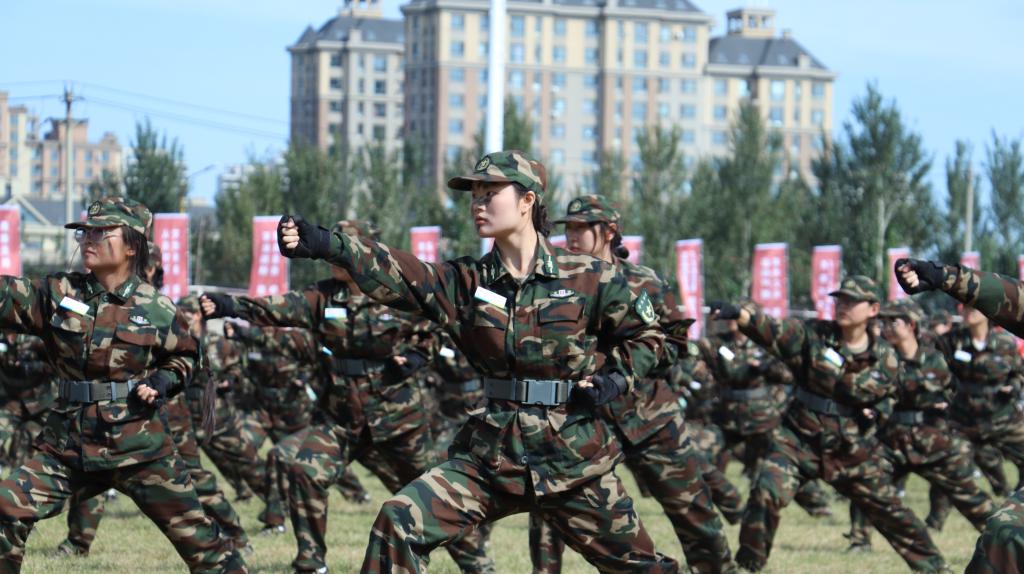 在军训成果汇报表演中,乐群校区的同学们表演了战术演练和军体拳,24名学生脸涂油彩、手持钢枪,射击、匍匐前进、对空警戒等战术演练精准到位。305名女同学组成的军体拳方队,一招一式,干练潇洒,尽显巾帼不让须眉。270名长吉校区的同学进行了刺杀操表演,动作流畅、气势恢宏。中工校区的800名同学以手中翻板,组成“学无止境、行为师表”“不忘初心、教育报国”等图案,阵阵口号喊出了长师学子强国有我、奉献青春的铮铮誓言,更生动表达了新时代青年坚定信念,紧跟党走,为祖国和人民奋斗的不懈追求。