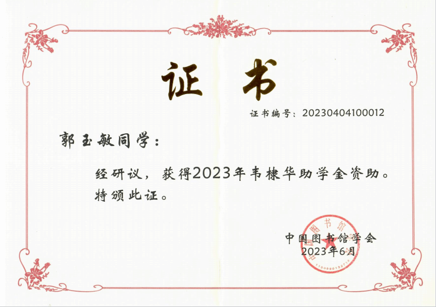 近日,中国图书馆学会公布了2023年韦棣华助学金评审结果,经评审委员会对全国本科和硕士培养单位申报的符合条件的申请人逐一审核、研议、投票,我校政法学院2020级图书馆学专业学生郭玉敏等32名学生荣获中国图书馆学会韦棣华助学金。