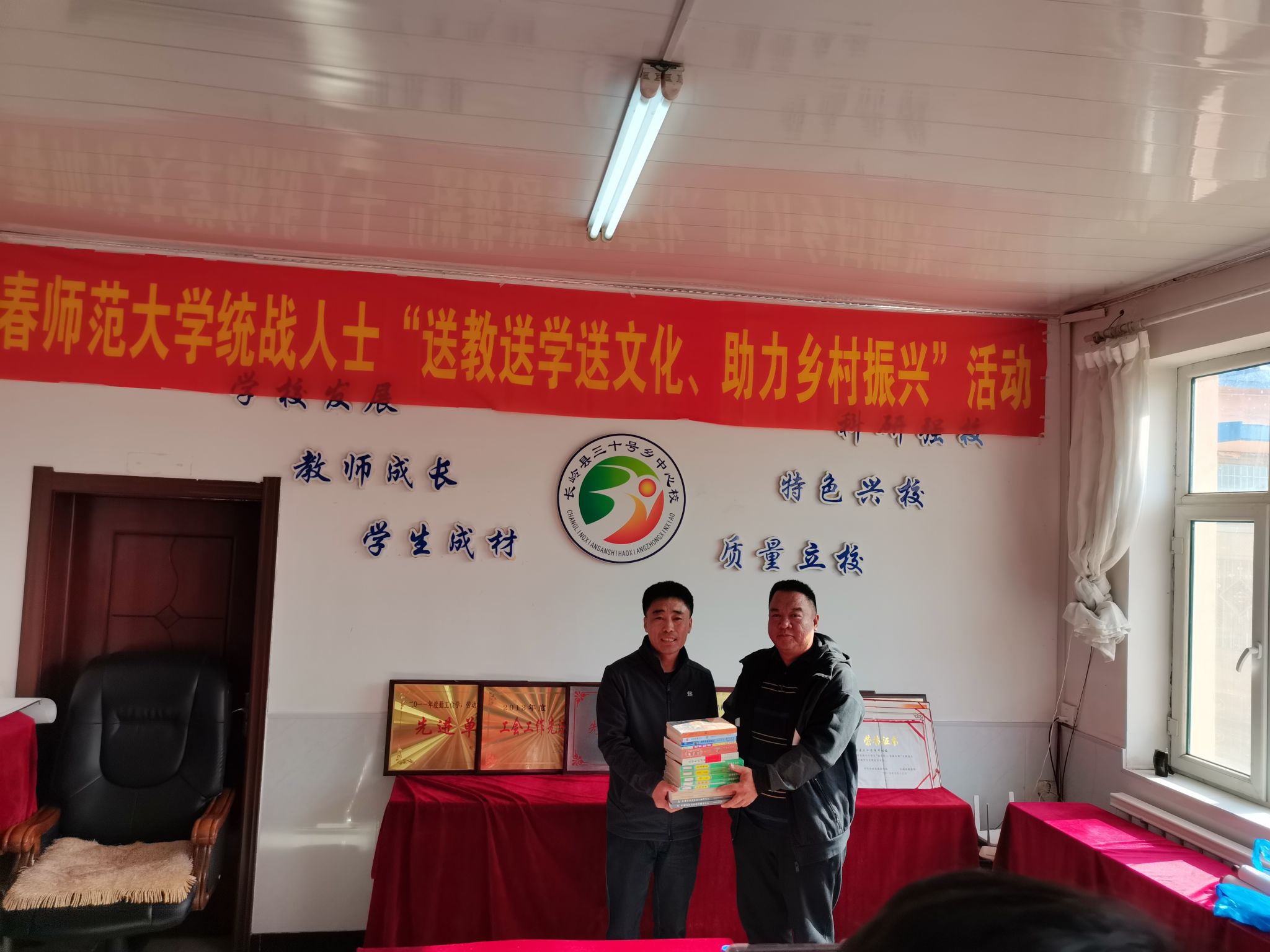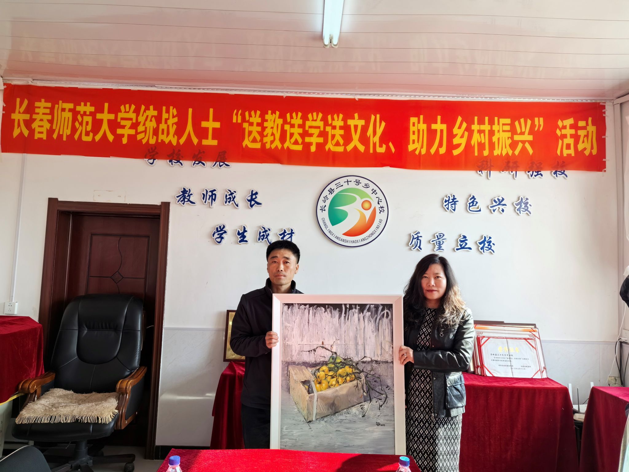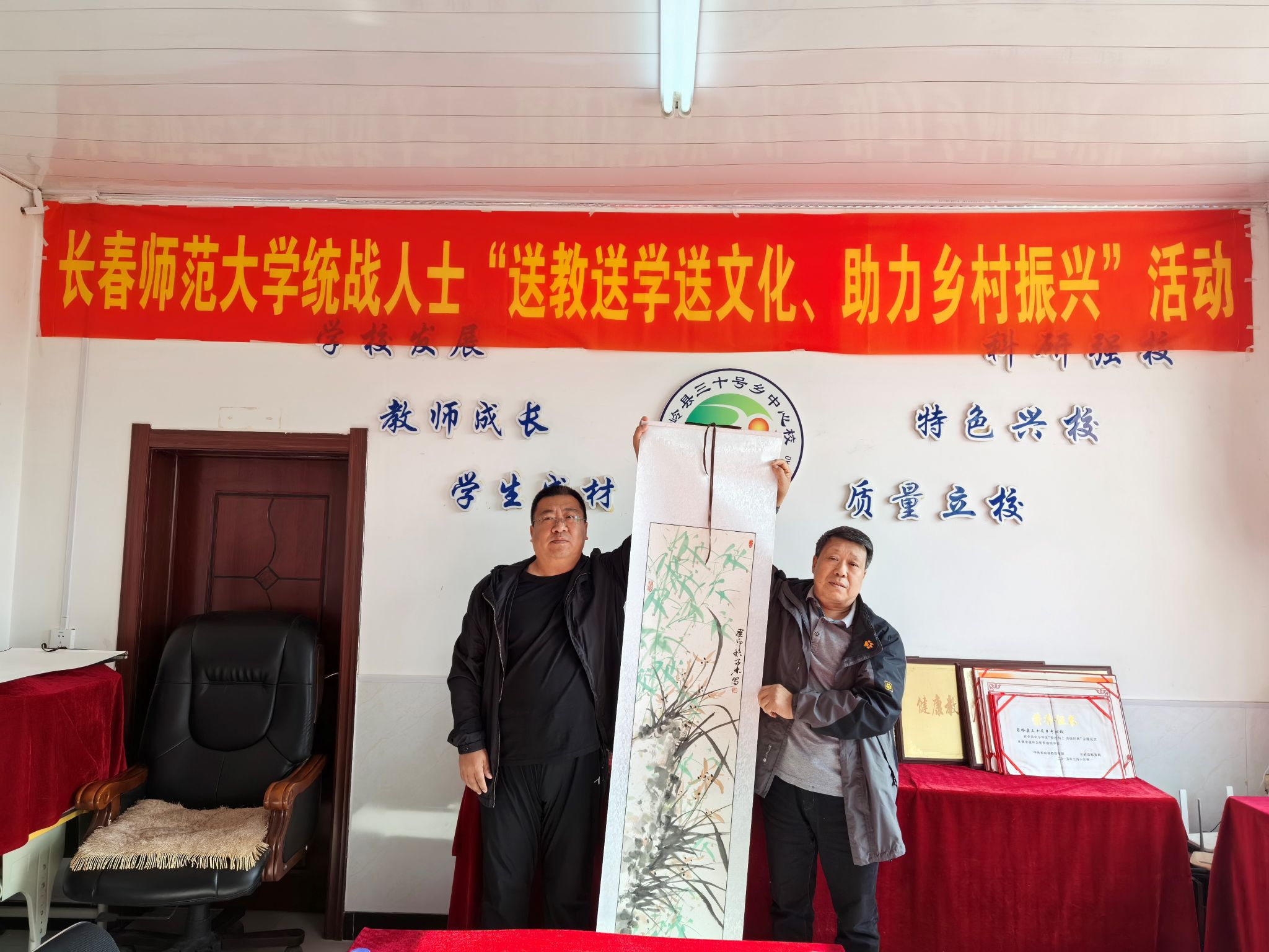 在“送文化”活动中,校民盟主委、国际合作与交流处处长袁晓红,校民进会员、美术学院教师王子林教授,以及九三学社社员、文学院教师邓锋副教授分别向三十号乡中小学领导赠送了由我校统战人士创作的书法作品、绘画作品、学习资料等。