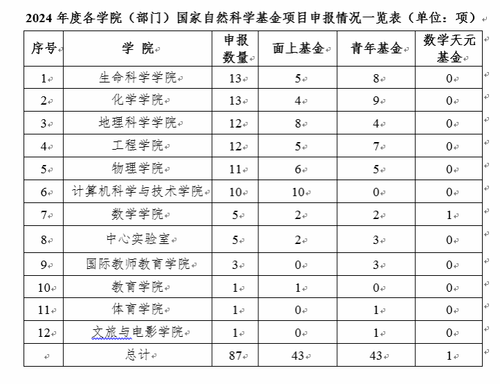 2024年,学校集中受理期申报的项目包括:面上项目43项、青年科学基金项43项、数学天元基金1项,总计87项。