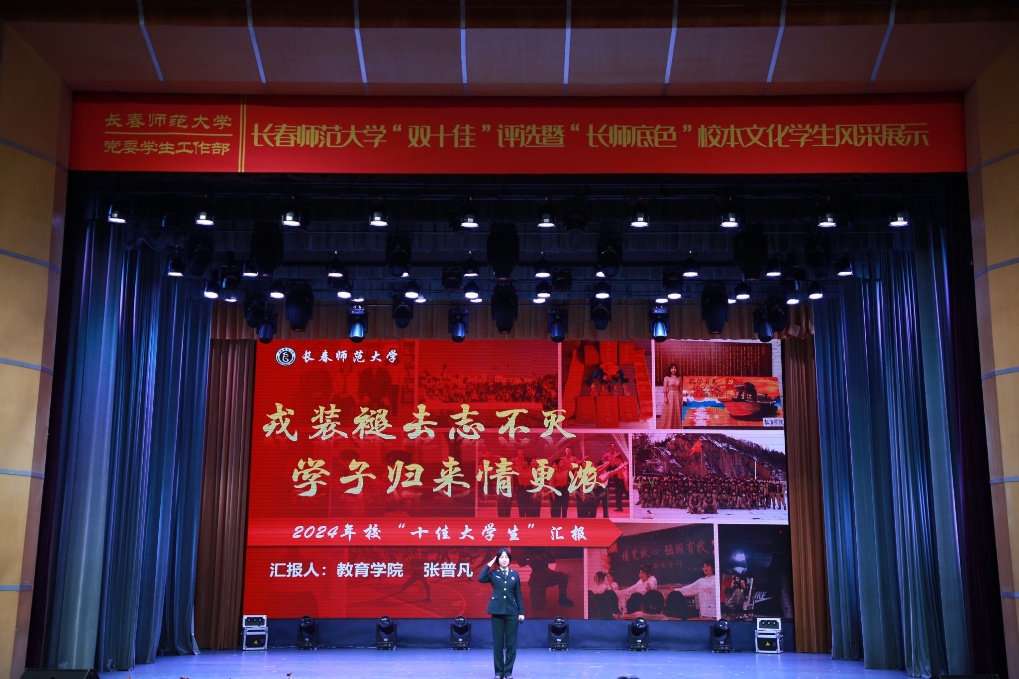 “两载从军路,一生报国情,戎装虽褪志犹存!我会继续勤勉进取,刻苦学习,以此来回报学校对我的培养。毕业后,我定会再次携笔从戎,献身国防,为军人使命奉献终身。”教育学院“十佳大学生”候选人张普凡在竞选时动容地说。