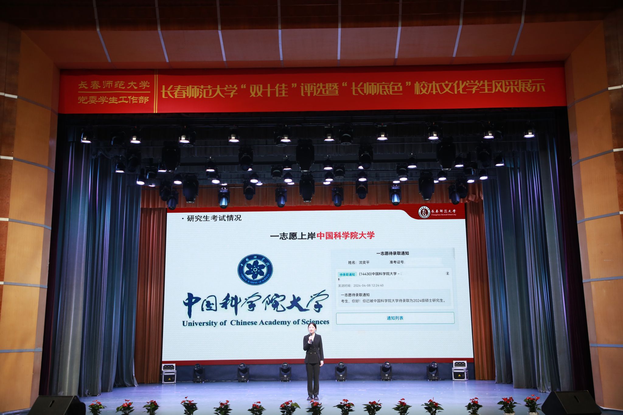 “我曾荣获国家奖学金、吉林省优秀大学生标兵等多项荣誉。如今,我以优异的成绩被中国科学院大学待录取为2024级硕士研究生,这一切感恩于母校和老师的教育和培养。”生命科学学院“十佳大学生”候选人沈奕平在竞选时饱含深情地说。