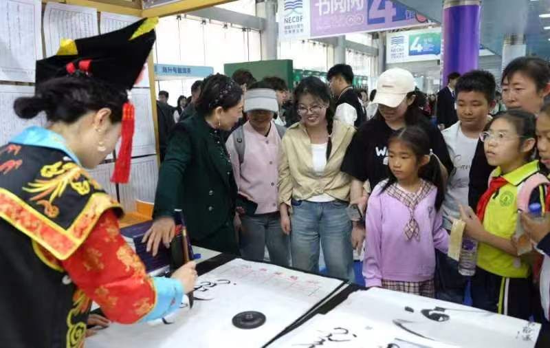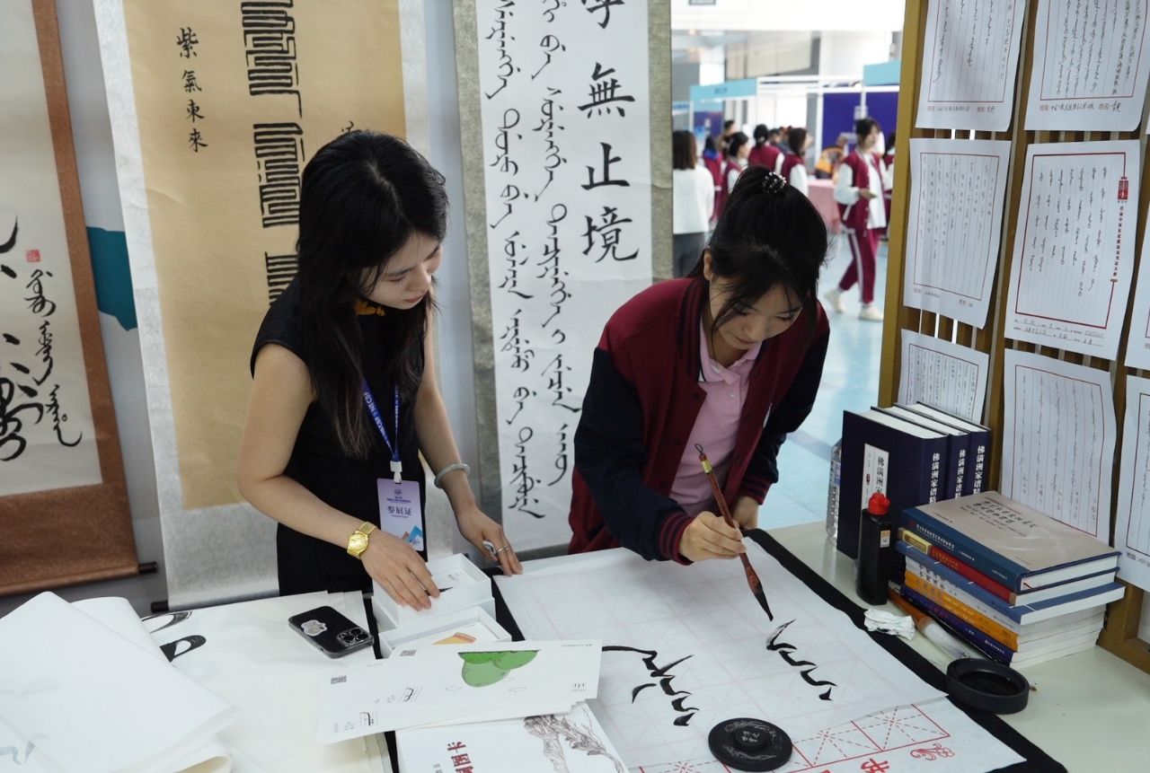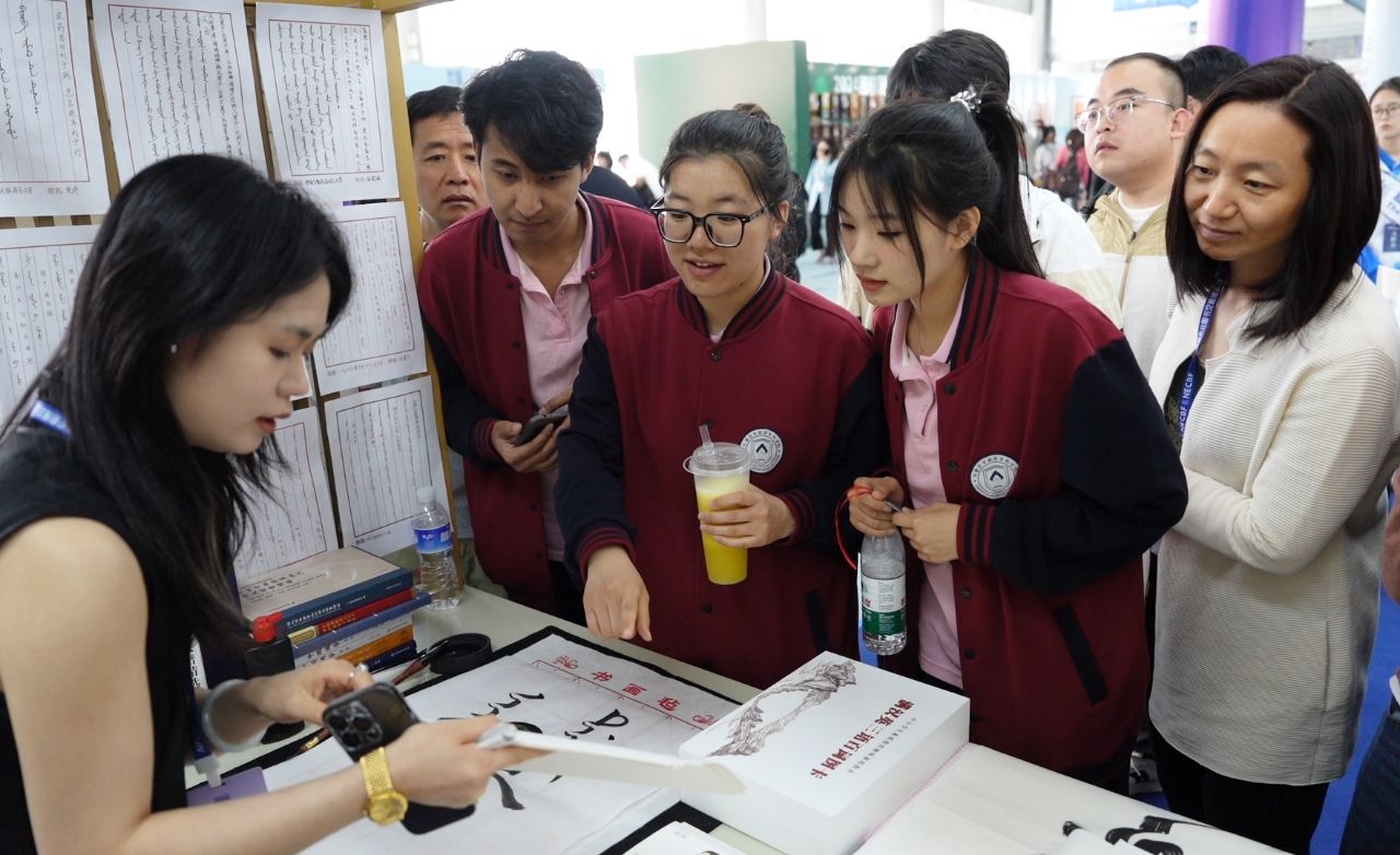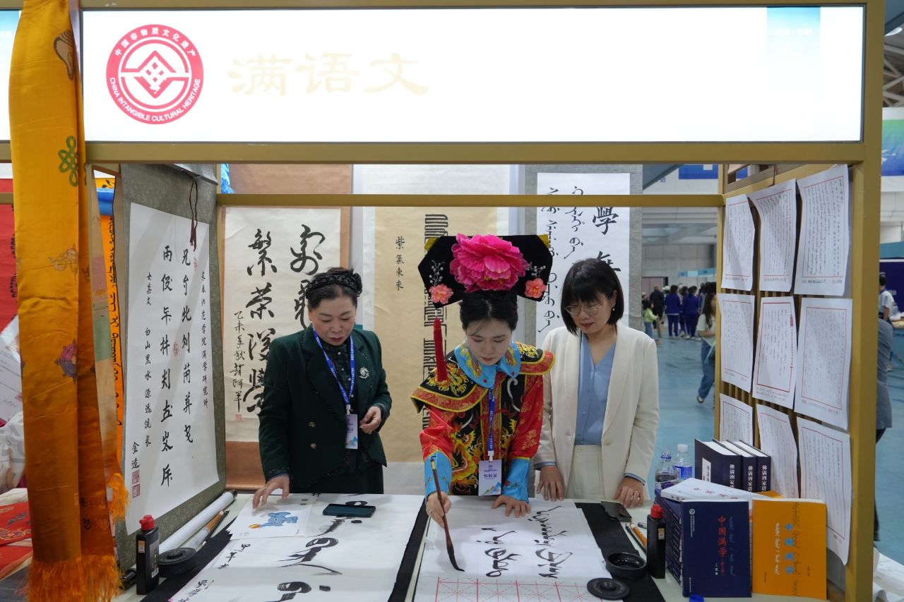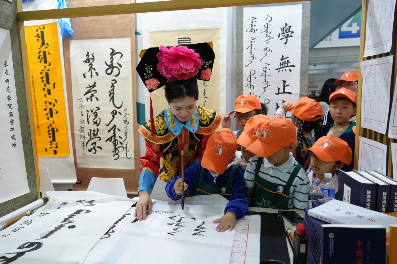 在为期三天的展览中,由我校历史文化学院吕萍教授带领的“满语文”项目团队火爆出圈。许多满语文爱好者前来观展,上到耄耋老人,下到几岁幼童,特别是少年研学班的小朋友更是学说满语、学写满文,将静态展览变成活态传承,科普了满语文知识,体现了“相聚吉地,共沐书香”的展会主题。