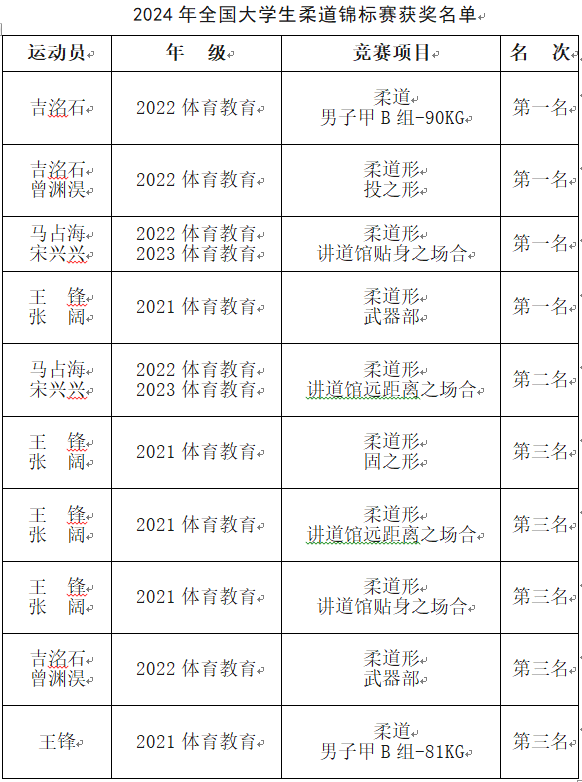 6月11日,在由中国学生体育联合会主办的2024年全国大学生柔道锦标赛中,我校体育学院体育教育专业6名学生组成的代表队荣获4金1银5铜,荣获柔道形团体总分丁组第一名。