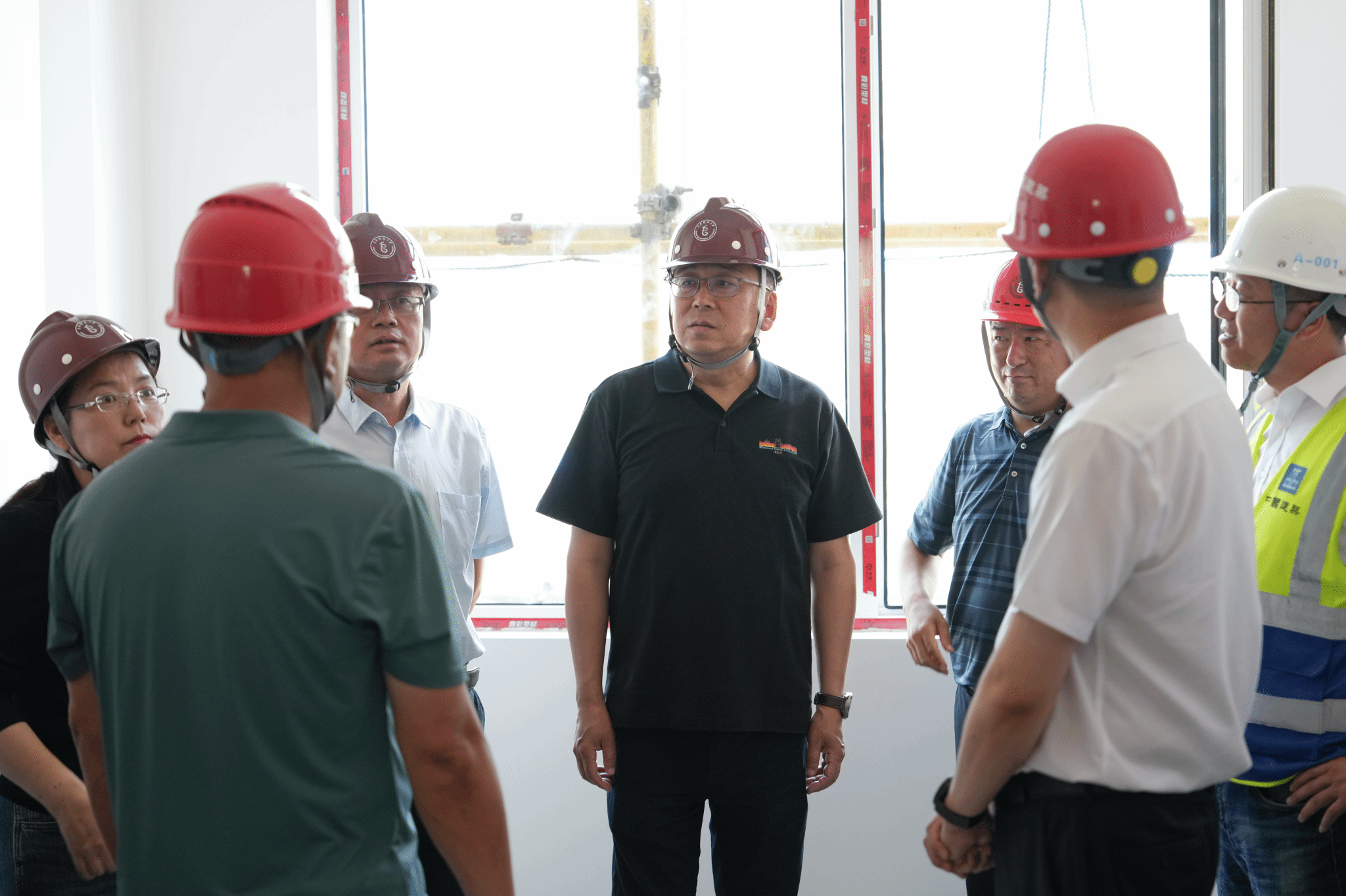 在新校区一期工程一标段理科第二组团楼,学校领导班子成员边查看施工质量,边听取情况汇报。