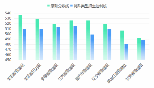 从分数上来看,学校普通类专业共计1210人投档,成绩高于生源省份相应科类特殊类型招生控制线的学生,占学校普通类专业招生计划数的51%以上。其中,河北、安徽、江苏、重庆、辽宁、黑龙江、甘肃等地的学生成绩,相应科类分数全部超过生源省特殊类型招生控制线。其中,河北省物理组、历史组的普通专业最低录取分数线均超过河北省特殊类型招生控制线。