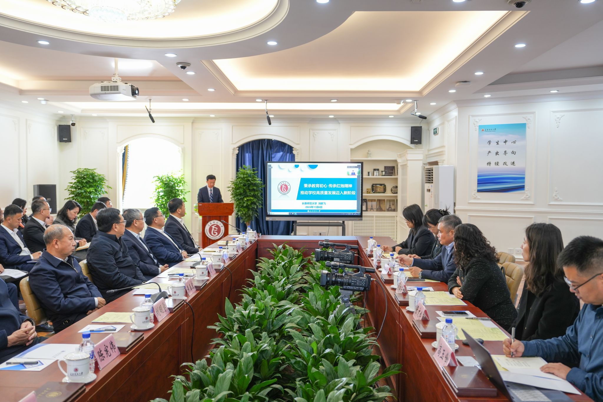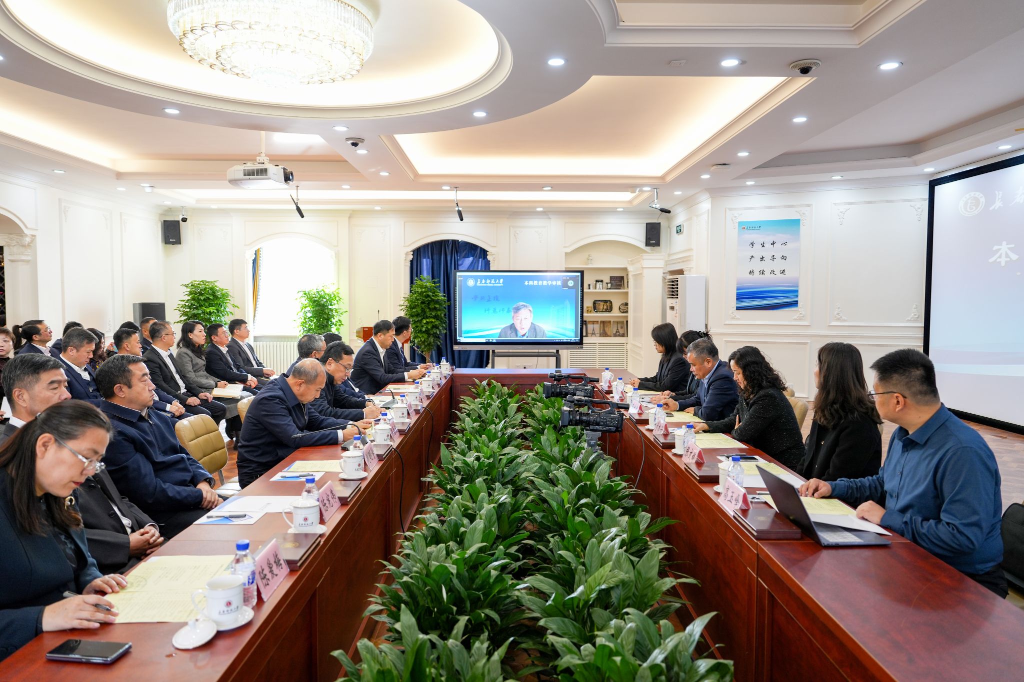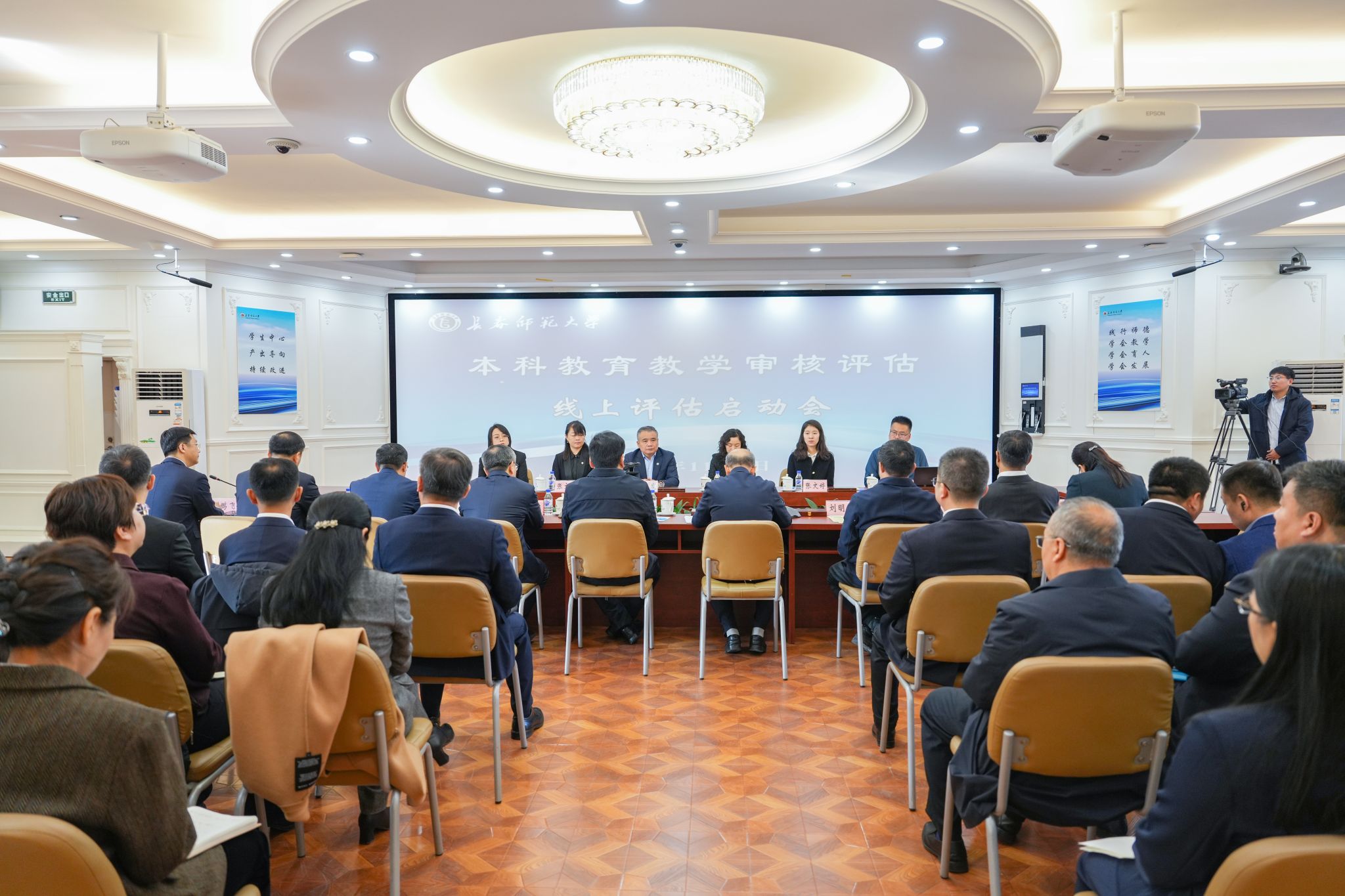 11月6日,学校在法国文化中心召开本科教育教学审核评估启动会。会议采用线上线下相结合的方式进行。教育部审核评估专家组组长、哈尔滨师范大学校长蒋鲲教授,专家组副组长、内蒙古师范大学副校长韩巍教授,专家组全体成员、项目管理员及秘书参加会议。吉林省教育厅二级巡视员燕春波,校党委书记刘多,纪委书记刘明学,党委副书记刘国宁,副校长陈宪伟、胡德超、陈爱梅、吴广峰出席会议。副校长刘鹏飞主持会议。