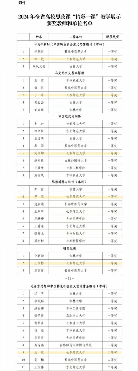 近日,我校师生在吉林省“精彩一课”、大学生讲思政课大赛以及微电影大赛中佳绩频传,马克思主义学院教师徐敏、于晗、刘伟坤、尹璐、王珈榕荣获一等奖,刘波荣获二等奖; 谢松霖、王深等2个学生团队荣获二等奖,林程文等2个学生团队荣获三等奖,充分展现出我校广大师生的卓越风采与雄厚实力,彰显了学校在思想政治教育教学领域的丰硕成果。