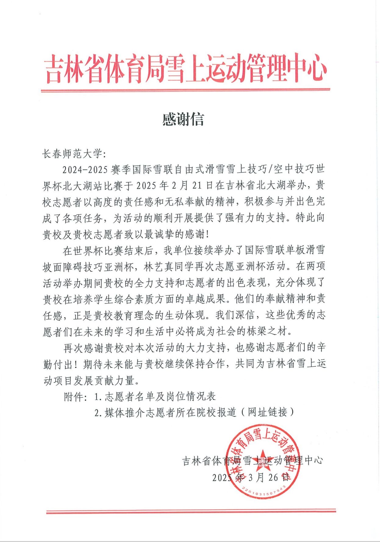 近日,吉林省体育局雪上运动管理中心发来感谢信,对我校在2024—2025赛季国际雪联自由式滑雪雪上技巧/空中技巧世界杯北大湖站比赛中给予的大力支持和“青松”志愿者的辛勤付出表示感谢。