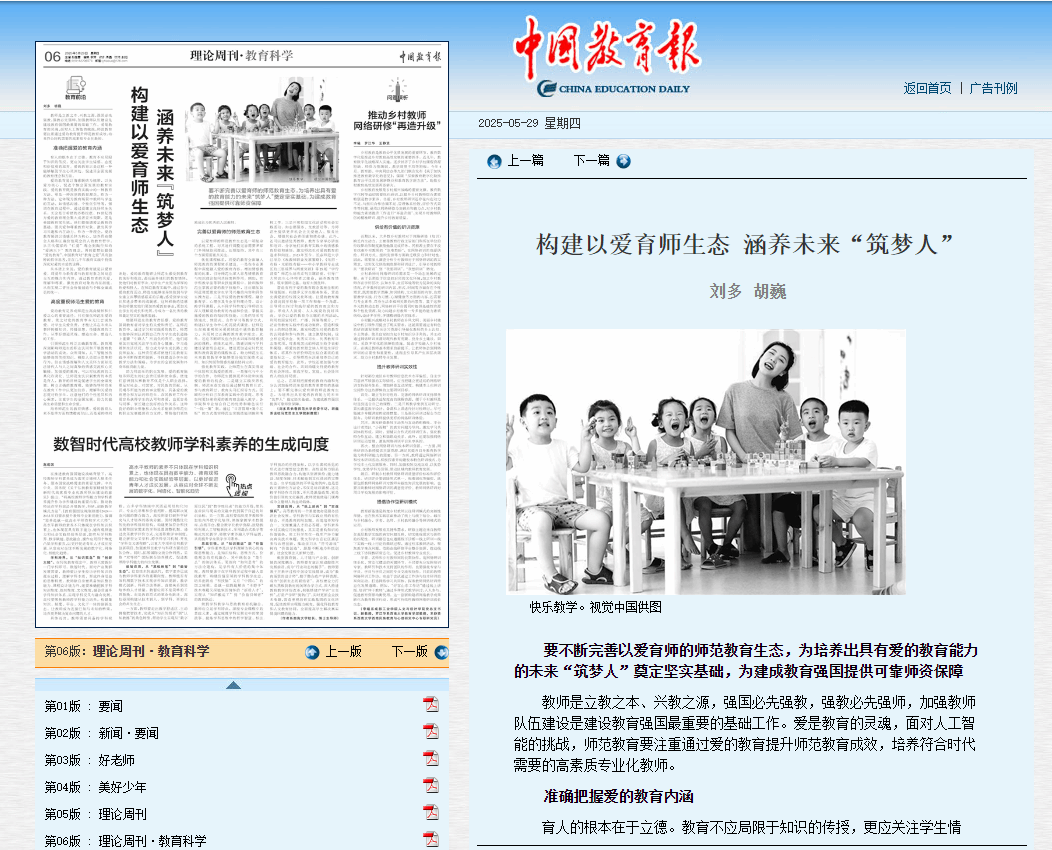 5月29日,《中国教育报》(理论周刊·教育科学版,第06版)刊发我校教师刘多、胡巍撰写的理论文章《构建以爱育师生态 涵养未来“筑梦人”》。